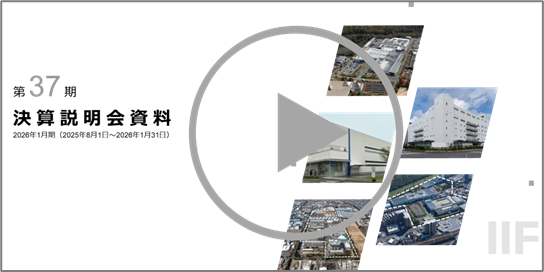 決算発表・動画 IR情報MENU IR情報 IR・PRニュース 決算発表・動画 IRライブラリ IRライブラリ一覧 臨時報告書関連書類 有価証券届出書関連書類 発行登録書関連書類(投資法人債券) 自己株券買付状況報告書 不動産投資信託証券の発行者等の運用体制等に関する報告書 規約 利益超過分配金に関する税務上の取扱い 分配金について 財務状況 財務ハイライト 負債の概要 借入金および投資法人債の状況 格付情報 投資口・各種手続き 投資口及び主な投資主に関する情報 名義書換について 投資主・投資法人債権者の権利 課税上の取扱い 投資主総会 アナリストカバレッジ IRスケジュール 投資家向けイベント・メディア掲載 個人投資家の皆さまへ 個人投資家の皆さまへ 産業ファンド投資法人(IIF)を知ろう 分配金のしくみ リスクについて ディスクロージャーポリシー 決算発表について スケジュール 2026年1月期 (第37期) 2026年3月17日(火)2026年1月期 (第37期) 決算発表 2026年3月18日(水)2026年1月期 (第37期) アナリスト説明会 ※アナリスト説明会は、オンライン会議にて開催いたします。 決算説明会関連資料 決算短信 決算説明会資料・参考資料